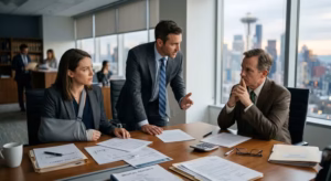 Personal injury claimant negotiating a settlement with a lawyer and insurance adjuster in a professional office setting
